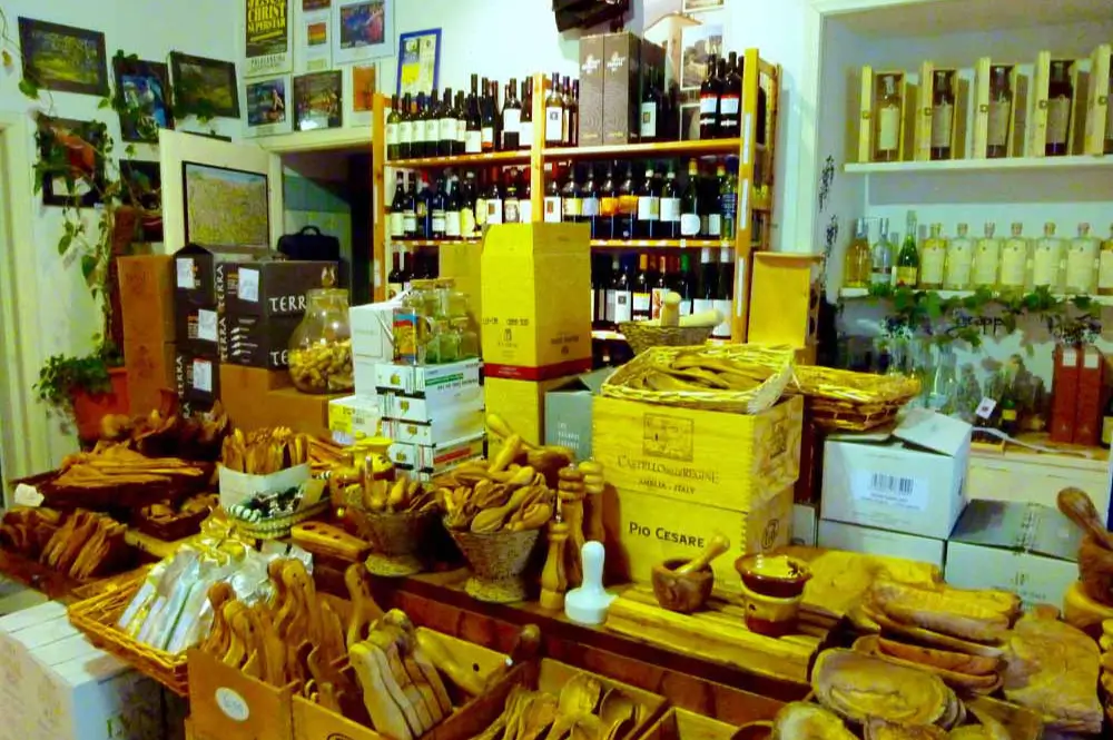 Das Sortiment reicht von Löffeln, Mörser, Vesperbrettchen, Käsereiben und Grillscheiten aus Olivenholz, über eine große Auswahl an Weinen aus der Region bis ins Piemont, Saucen (Sugo) in allen Variationen, getroknete Steinpilze (Porchini), Grappe, Limoncello und andere bis zu einer großen Auswahl an Oliven-Ölen.