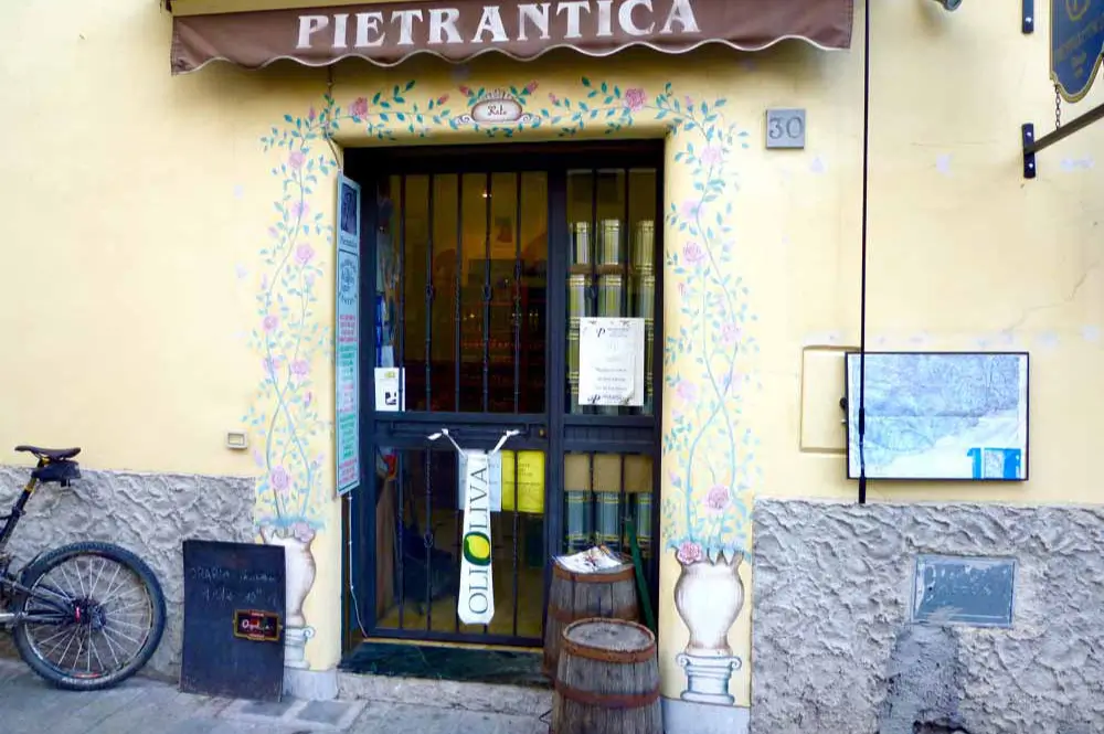 In seinem Geschäft “Pietrantica” mitten auf dem Dorfplatz von Dolcedo offeriert Vittorino Falchi Olivenöle, Weine und viele weitere Produkte der Riviera dei Fiori (Blumenriviera).