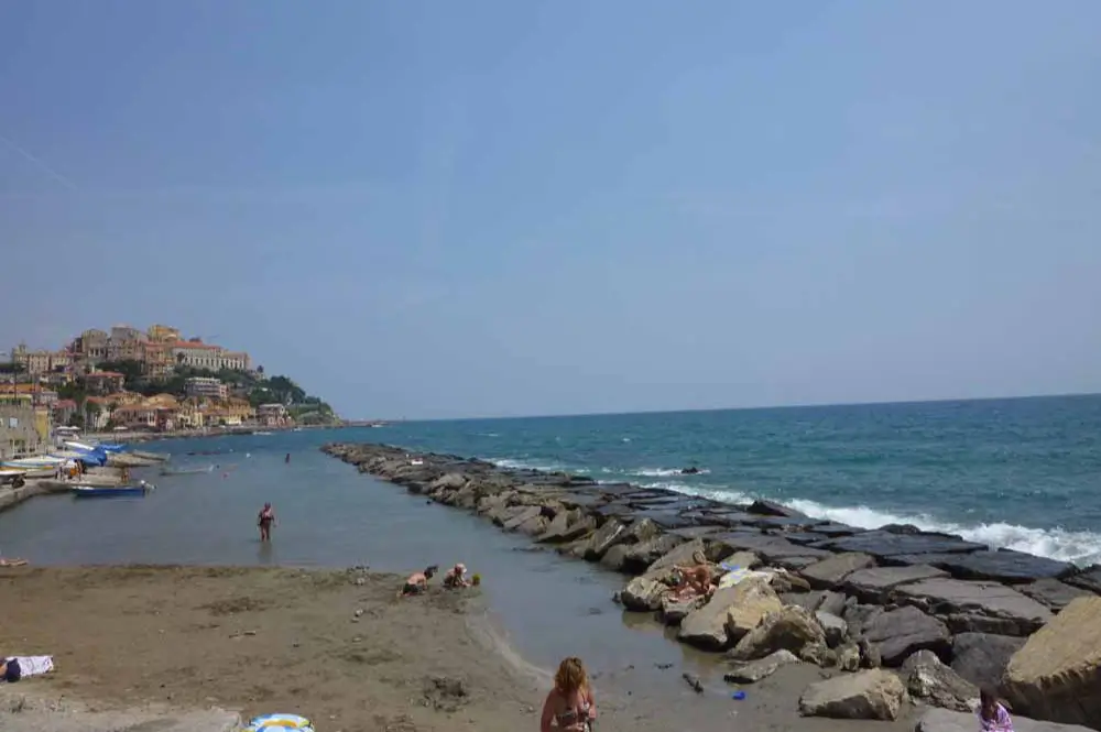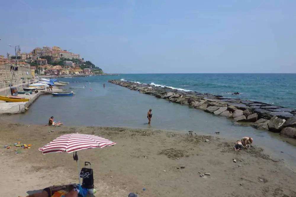 Imperias Stadtstrand: Sandstrand am Hafen von Porto Maurizio. Sehr schöner Sandstrand an der Hafenmole.