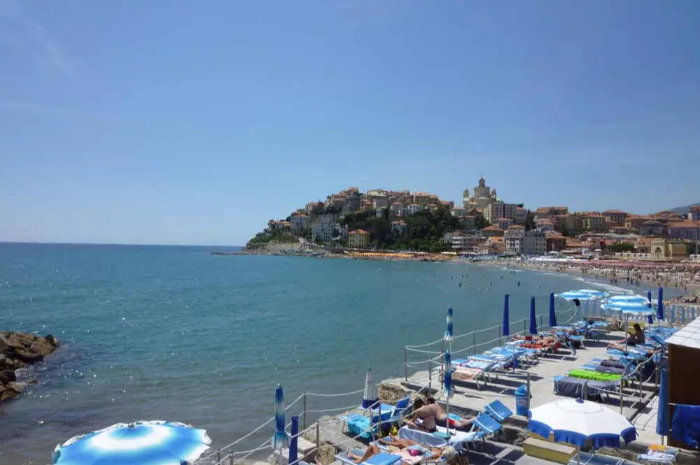 Der Spaggia d’Oro ist einer der schönsten Sandstrände um Imperia. Er liegt am Fuße von Porto Maurizio direkt am Hafen. Ein großer Teil des Strandes ist mit Liegen und Sonnenschirmen gestuhlt und kostet Eintritt (2 Liegen und ein Schirm 13.- Euro für einen halben Tag).