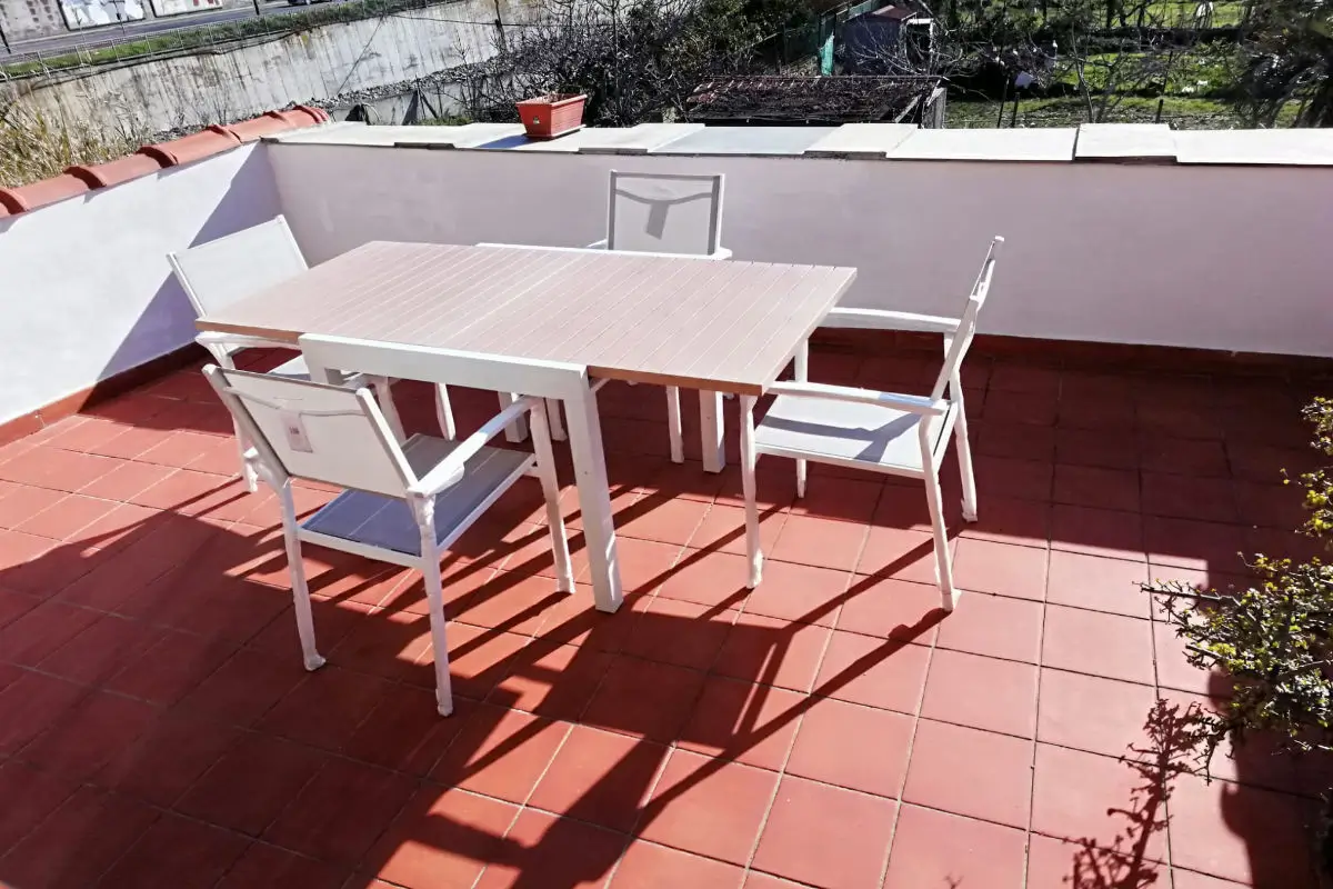 Sie befindet sich traumhaft ruhig und sonnig im ersten und obersten Stockwerk der Dreifamilienwassermühle, mit einer 20qm großen sonnigen Terrasse mit einem neuen, ausziehbaren Aluminiumtisch und Stühlen.