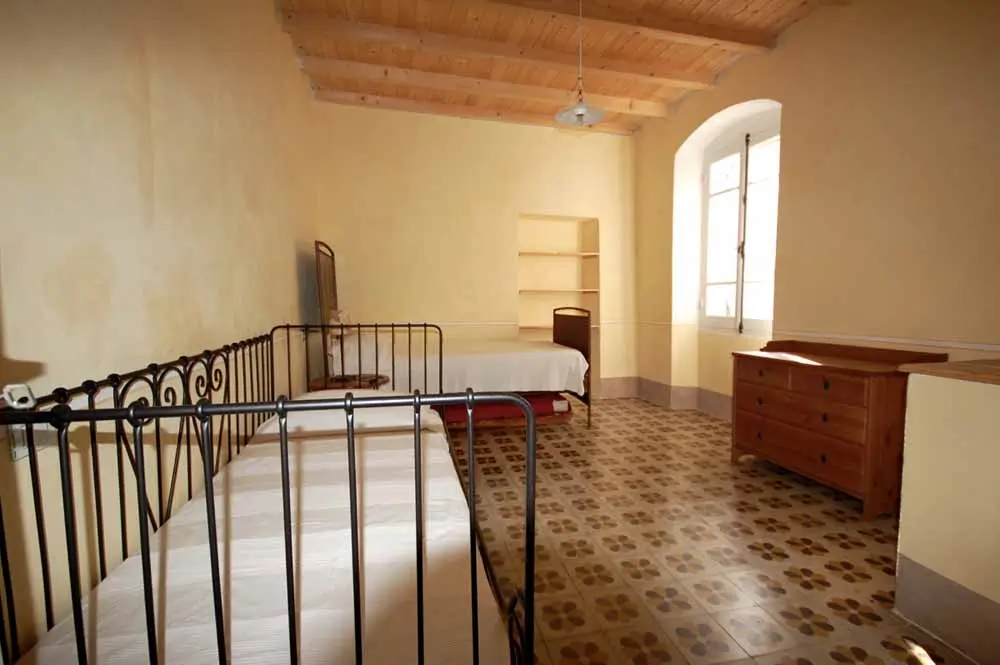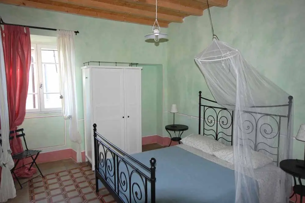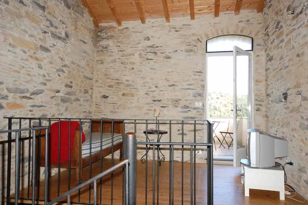 Über eine Wendeltreppe gelangt man in den oberen offenen Wohnbereich mit Schreibtisch, Divano, Sat-TV und mit Ausgang auf die kleine Terrasse mit herrlichem Tal- und Meeresblick. Die beiden Schlafzimmer, ein Elternschlafzimmer mit Doppelbett und ein Schlafzimmer mit drei Einzelbetten befinden sich ebenfalls im oberen Stock.