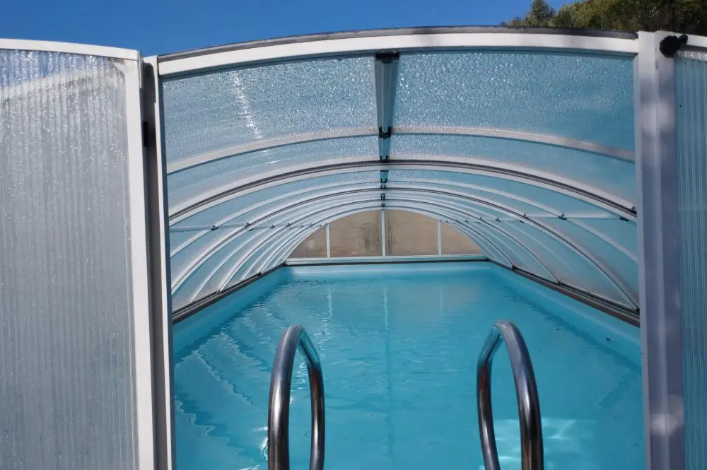 Mit Hilfe eines Schiebedaches kann der Pool abends zugedeckt werden. So können angenehme Wassertemperaturen auch in den Randmonaten genossen werden (auch im „Hallenbad“)
